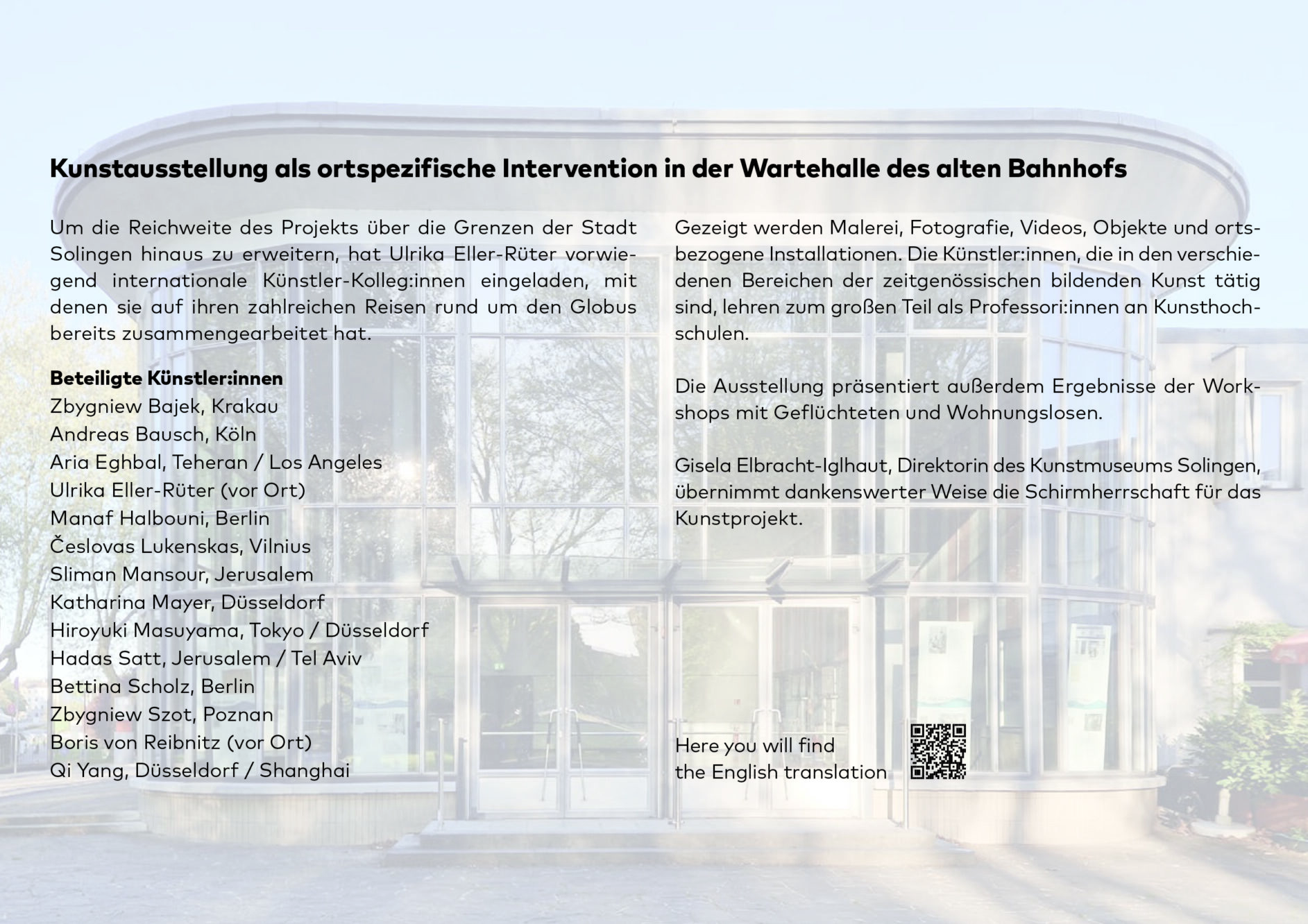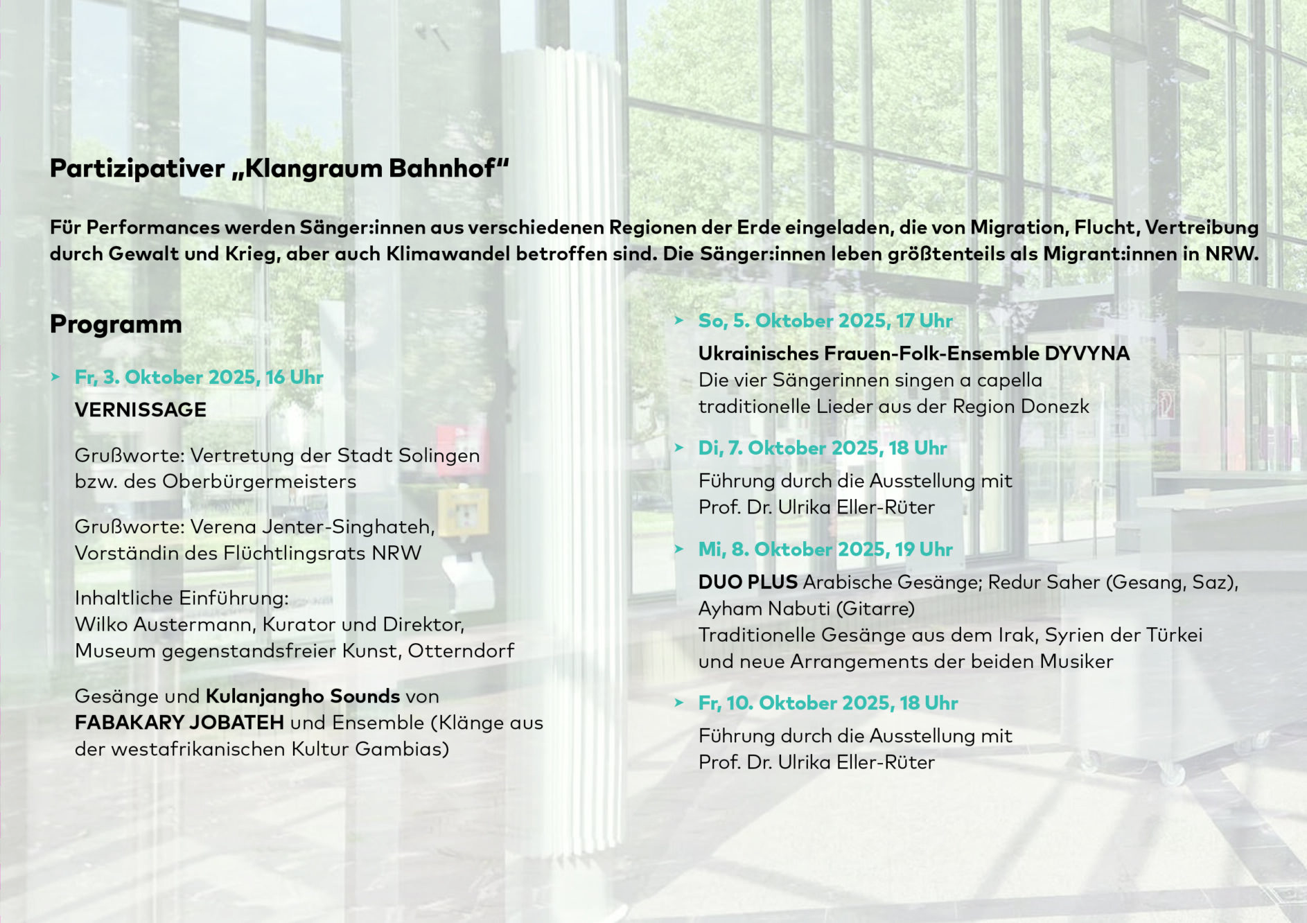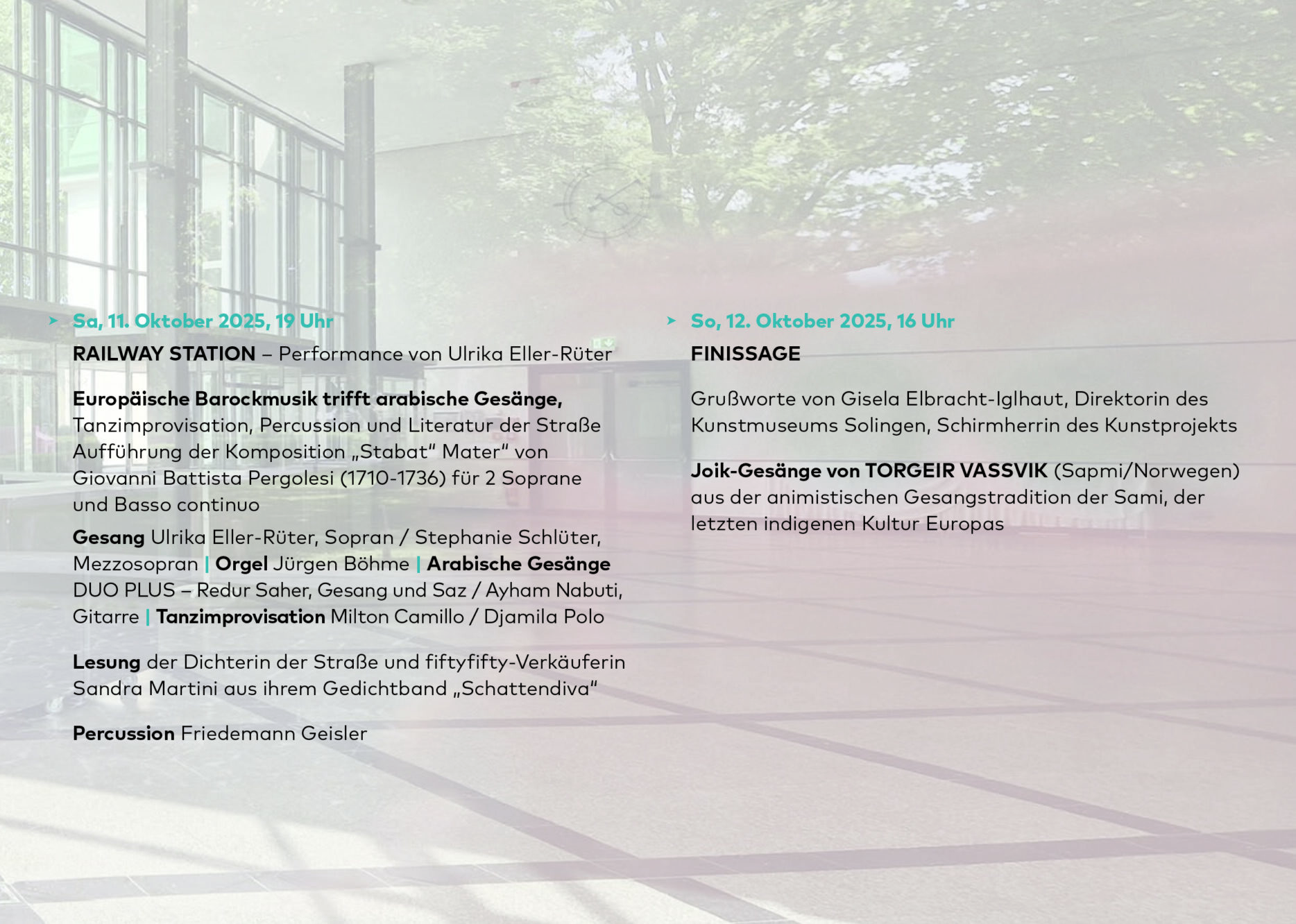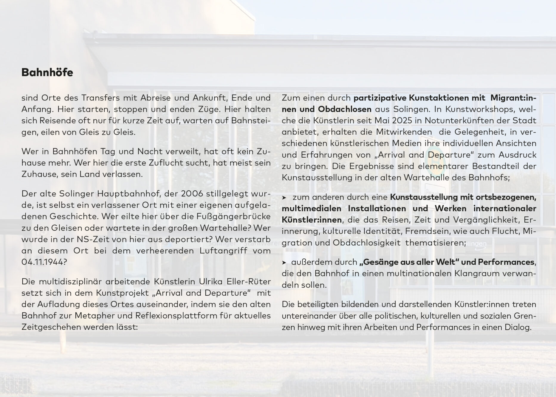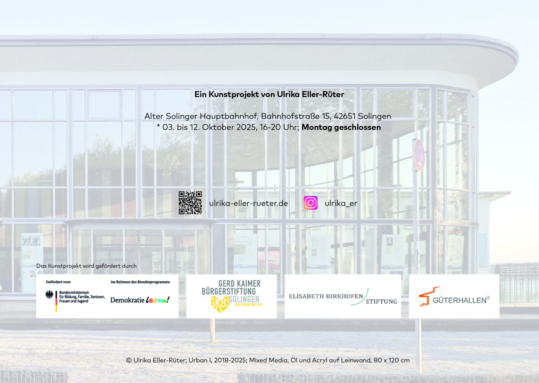Arrival und Depature I 3.10. – 12.10.2025 I Bahnhofstr. 15, 42651 Solingen I 16 – 20 Uhr I Vernissage, Fr. 3.10.2025, 16 Uhr I weiter unter Aktuelles https://ulrika-eller-rueter.de/ak