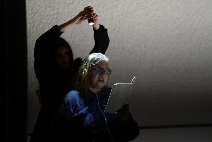 Flächen eingearbeiteten phosphoreszierenden Flächen in einer Art Lichtmalerei mit Taschenlampen aufleuchten lässt. Die eingefangenen Handgesten und Silhouetten der Frauen aus dem „Schatten der Gesellschaft“ werden so Teil der Performance.