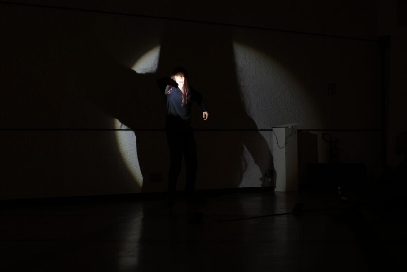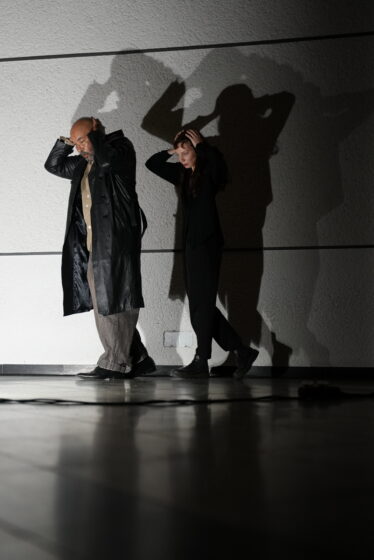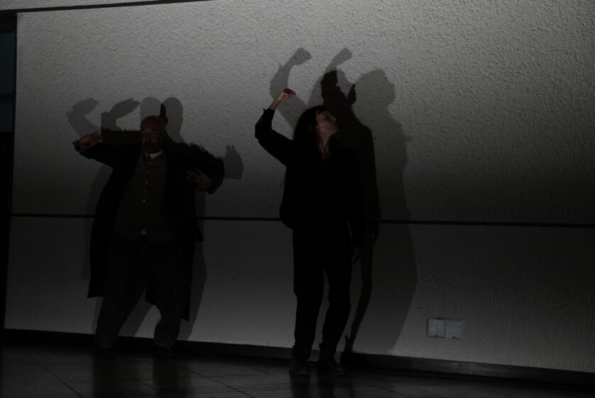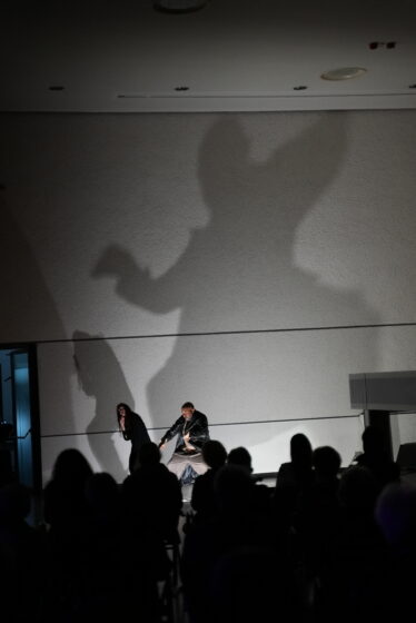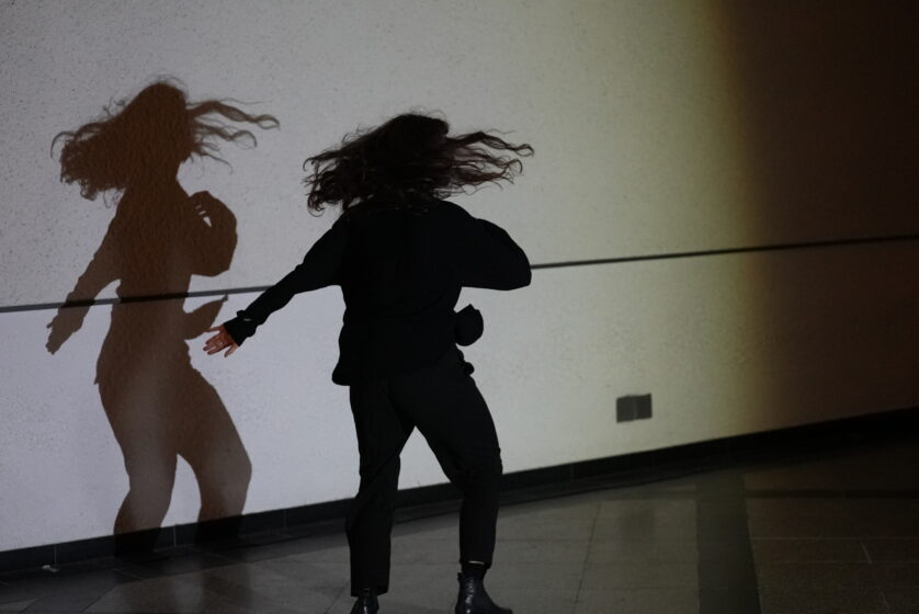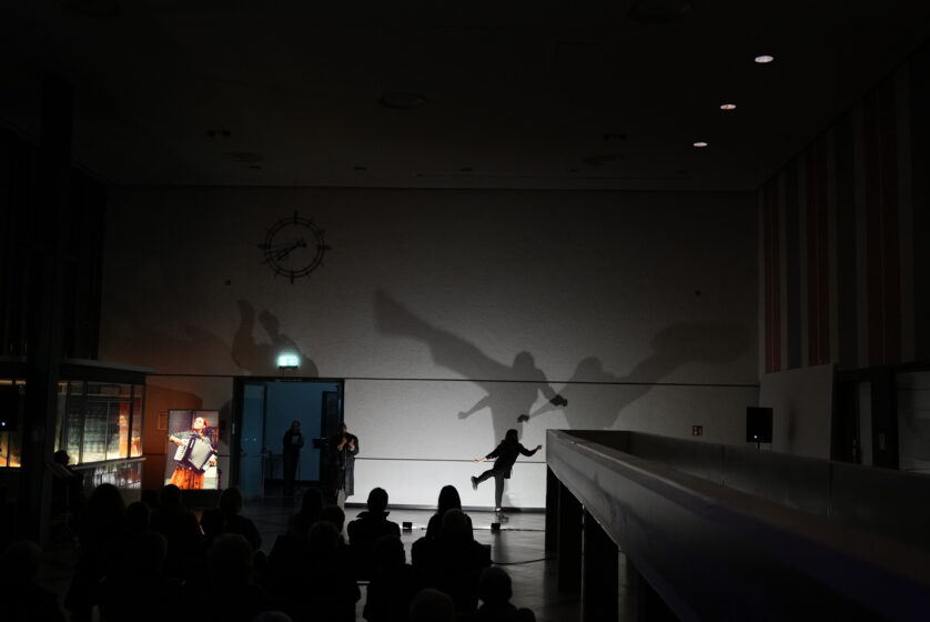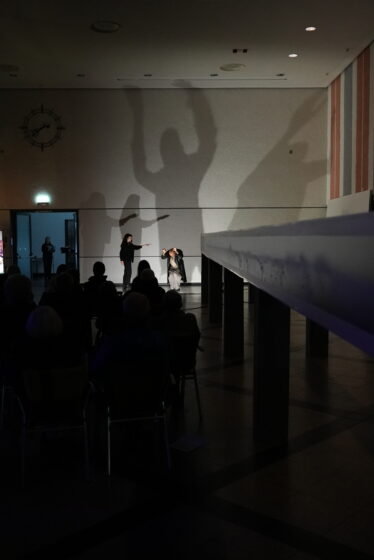 Ein Tänzer „kommentiert“ durch seine Bewegungen durch den in Schwarzlicht getauchten Raum die Musik und tritt in Dialog mit den in der Installation präsenten Schattenfiguren, indem er die in die
